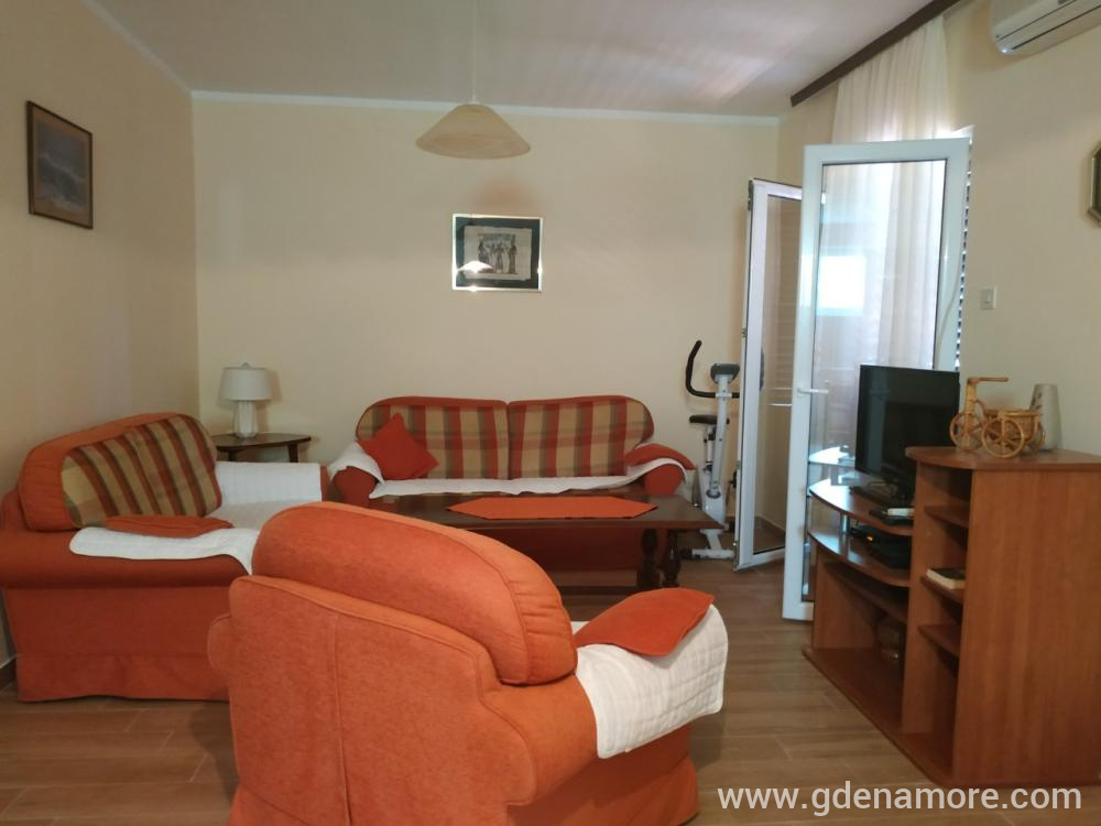 U sklopu apartmana je veliki dnevni boravak, trpezarija, kuhinja komplet opremljena. U dnevnom boravku je TV i klima uređaj. Takođe ima hodnik, dvije dvokrevetne sobe i kupatilo sa tuš kabinom (novo), veš mašinu i fen za kosu. Iz dnevnog boravka se izlazi na veliki balkon sa koga se pruža pogled na zaliv.